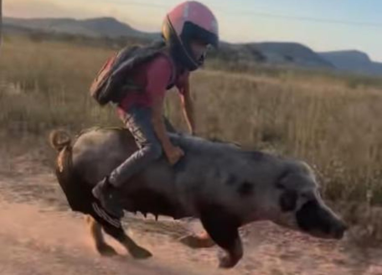 巴西9岁男孩古蒂尼奥·罗查因骑猪上学走红网络。他训练的宠物猪“福盖特”(葡萄牙语“火箭”)速度惊人,仅需1分钟即可完成2公里的上学路程,下午1点上课的他甚至能12:59出发仍准时到校。为保障安全,古蒂尼奥骑行时会佩戴摩托车头盔和护目镜,并自制“猪鞍”固定身体。